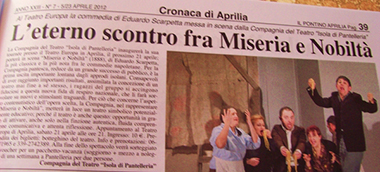 Una sintassi teatrale di espressioni ed impressioni inattese, quella dei ragazzi della Compagnia del Teatro "Isola di Pantelleria", rientrati più che soddisfatti dalla tournée in Aprilia con un bagaglio esperenziale arricchito di nuove emozioni ed ottimi riscontri da parte della platea agropontina. Nell'affacciarsi sulla scena, un numeroso e caloroso pubblico sosteneva il loro ormai ben noto impegno teatrale, "Miseria e Nobiltà", del celebre Eduardo Scarpetta. E, da attori non professionisti quali sono, si è giunti ad una importantissima conquista anche sotto il profilo di una stretta collaborazione e di una comprensione reciproca che hanno saputo allontanare possibili divergenze all'interno di un vero e proprio "piccolo gruppo sociale", e in mancanza delle quali l'aspirazione al "successo" si sarebbe rivelata un deludente miraggio.